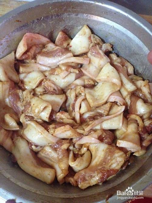 2、之后,我们在切好的肉上面加入少许料酒、切好的辣椒、葱、姜和八角腌上。