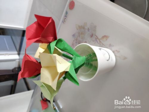 花茎的话只能选择绿色的彩纸,如果没有的话,可以将花茎卷好后涂上绿色。将一张正方形的绿色的纸,沿着一角搓起来,搓完之后变成一个小棒粘起来就行。