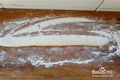第五、把面放在面板上,揉好,然后搓成长条(揉的时候多揉一会,这样面会更加的筋道,揉面的时候记得垫一些干面,这样就不粘了)。