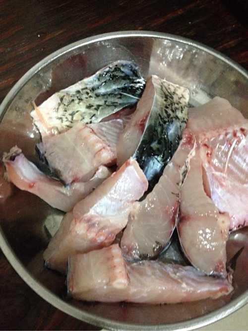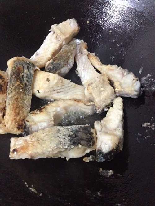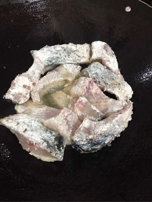 鱼剁块用盐腌制一会,下锅煎前泡洗清爽备用。