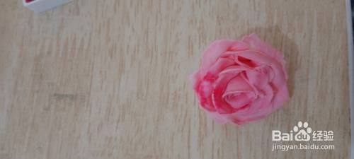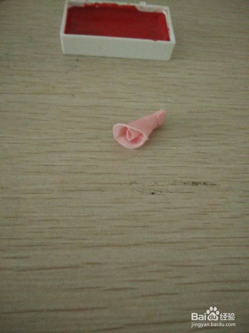将粉红色粘土取一小块,用勺子压成一块扁扁的花瓣形状,然后将这片花瓣卷起来,玫瑰花里面的花瓣要紧密一些,所以直接将花瓣卷起来即可