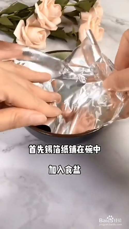 在锡箔纸上撒上一层的食盐,然后将银镯子放进去。