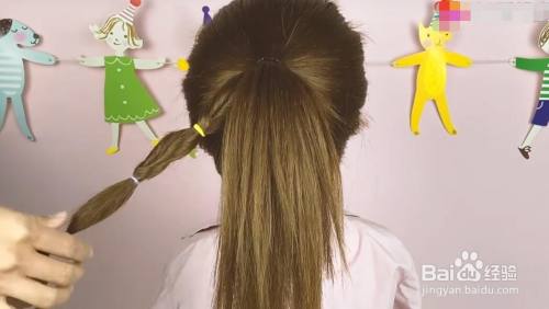 将马尾分为三个部分后,从左边开始依次用橡皮筋扎头发。