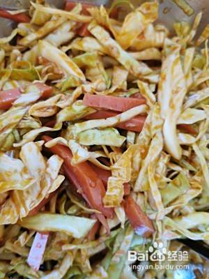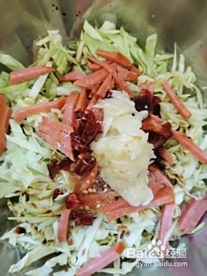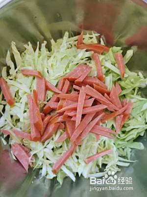 甘蓝切丝,蒜蓉肠切丝,放进大一点盆,方便拌。