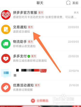 我们进入拼多多聊天界面后,找到交易通知;