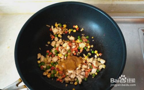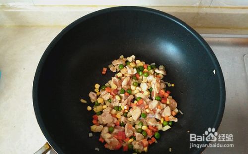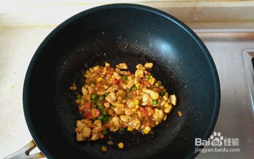 放入剩余的土豆丁、青豆、胡萝卜、玉米粒、鸡柳1分钟翻炒。