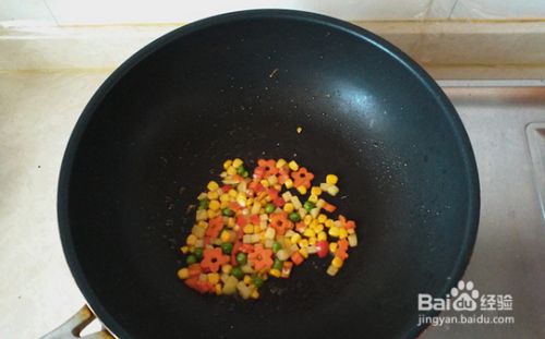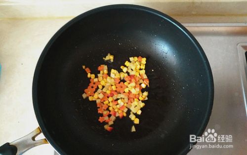 先炒摆盘用的食材,切好的土豆丁、胡萝卜丁、玉米粒拿一半放到锅子里。