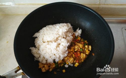 加入刚才煮好的咖喱酱,依据个人的口味加入,由于咖喱酱已经有调味料了所以不需要加任何的调味料,我做的是三人份的炒饭所以加了约4汤匙的咖喱酱。