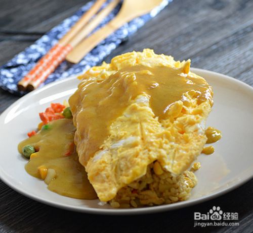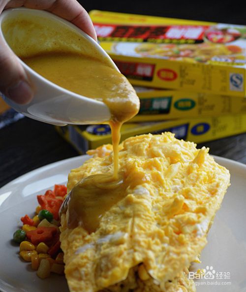 做好的鸡蛋马上放到炒饭上面,我煮的鸡蛋还是熟了点不够柔软没有弹性,吃的时候用小刀对着鸡蛋的中心切开,这样鸡蛋就会往左右两边覆盖着炒饭,然后淋上刚才剩余的咖喱酱。