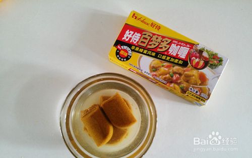 咖喱块放入碗里加入一碗热水浸泡,水量是饭碗的分量。