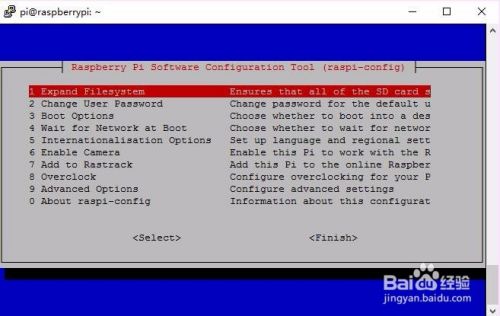 拓展根分区空间;df -h查看当前文件系统大小,发现小于8G空间,说明烧录系统后SD/TF存储卡部分存储空间没有初始化文件系统,所以无法被使用;输入命令: sudo raspi-config 后,出现图形界面,选择“1 Expand Filesystem”,一路Enter后,Finish退出即完成了根分区空间拓展。再次使用df -h命令可以发现根分区大小已经被扩容,可以使用这部分存储空间了。