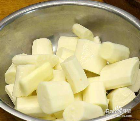 准备一根山药,把外皮削干净放入清水中洗干净,切成均匀的滚刀块放入盆中用清水泡上,以免氧化变黑。再切一点姜片和大葱段备用。