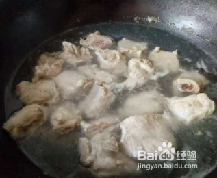 锅内烧水,把排骨凉水放入锅中,加入一点食盐入底味,料酒10克,水烧开以后沿锅边打去浮沫,大约煮2分钟,把排骨倒出来用清水冲洗干净,控水备用。