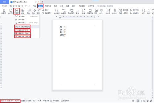 打开一个需要编辑的WPS文档,在菜单选项处单击【插入】,然后在出现的第二行的子菜单中找到红色方框圈出的【分页】,单击旁边向下的箭头,弹出选项里面包括【下一页分节符(N)】【连续分节符(T)】【偶数页分节符(E)】【奇数页分节符(O)】。