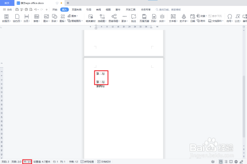 【连续分节符(T)】指从输入光标处,插入连续分节符后就变成了下一节。如下图所示,将输入光标放置于“第二行”后面,点击【连续分节符(T)】,则“第二行”和“第三行”新增了一行,从这行开始就是第三节了。