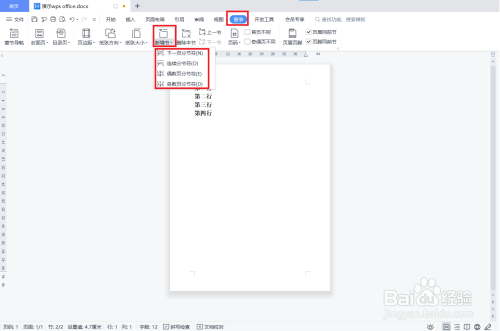 也可以在菜单选项处单击【章节】,然后在出现的第二行的子菜单中找到红色方框圈出的【新增节】,单击旁边向下的箭头,弹出选项里面包括【下一页分节符(N)】【连续分节符(O)】【偶数页分节符(E)】【奇数页分节符(D)】,用法同上。