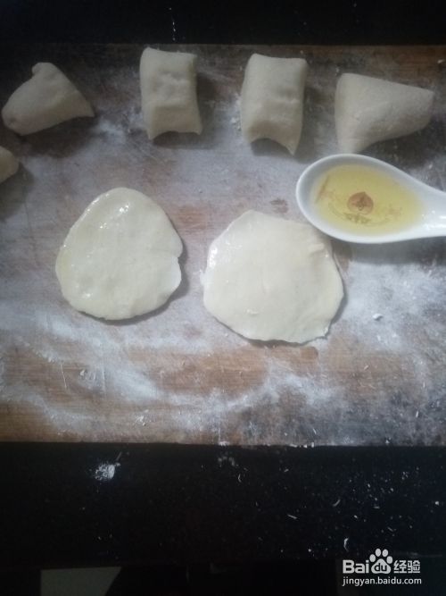用擀面杖将小面团压成薄薄小片,刷上油,重叠在一起,再用擀面杖推薄推大,越薄越好。