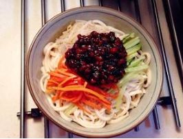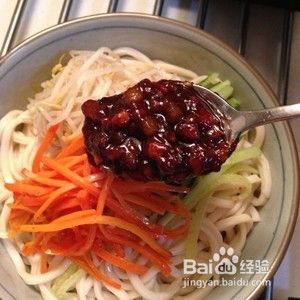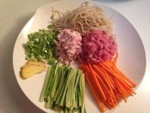 鲜肉切丁,黄瓜,胡萝卜切丝。豆芽菜焯水,胡萝卜过油煸炒。