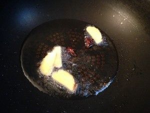 等油八成热后,先放八角和姜片,把肉丁放进去炒变色,肉丁炒到有些焦黄。