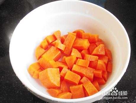 胡萝卜清洗干净后,将其切成块或者是片,隔水上锅将其蒸熟,然后盛出来用勺子压成泥,待用,菠菜摘洗干净后,在锅中添上水;