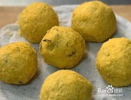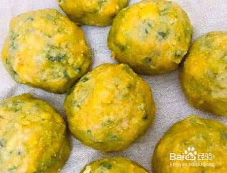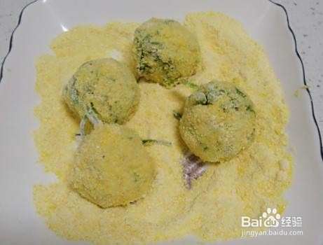 戴上一次性手套将菠菜玉米团子捏成一个个的小团子,依次做好所有的后,将其放入玉米面粉中裹一圈,轻轻粘裹一层玉米面就可以了;