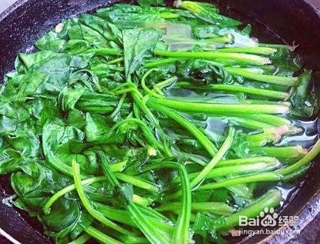 待将水烧开后,加上几滴食用油,放入菠菜焯下水,差不多1分钟的时间,即可将菠菜从锅中捞出来,挤干其中的水分,将菠菜剁成碎末用;