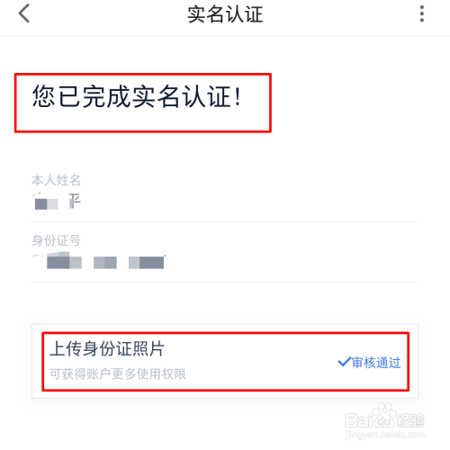 第四,此时会让你上传自己的身份证照片,按照系统的提示一步一步来就行,照片上传完成后,会提示“您已完成实名认证”