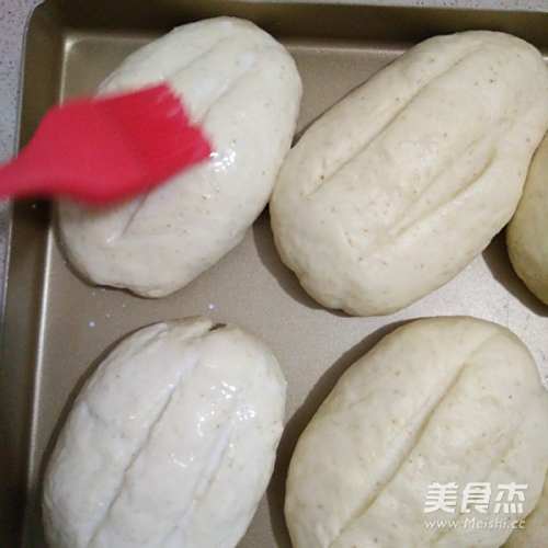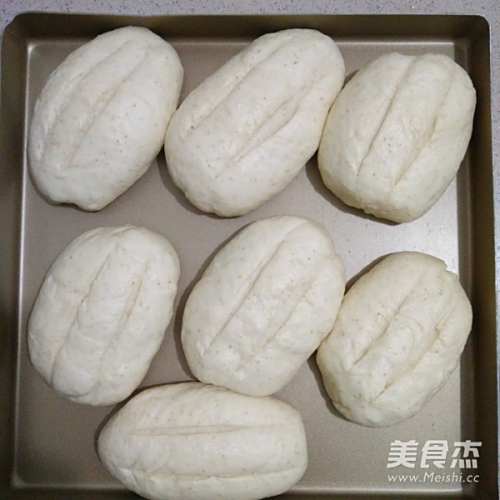 7摆入烤盘中放入烤箱中发酵,烤箱中放入一碗温水发酵,发到1.5大时用刀片切口竖口