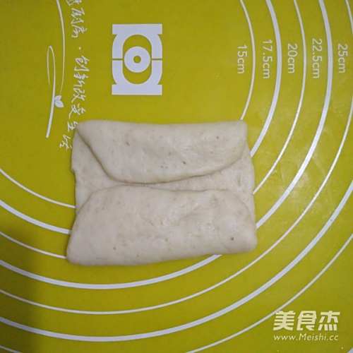 5从面包机中把面拿出来排气,多揉几下让面团醒发,面团用擀面杖擀成长舌头状,像图中这样卷