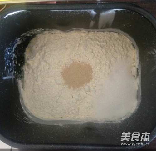 1除了黄油,依次放入酸奶,鸡蛋,面粉,一边角放盐,一边角放糖,中间放酵母启动揉面程序20分钟