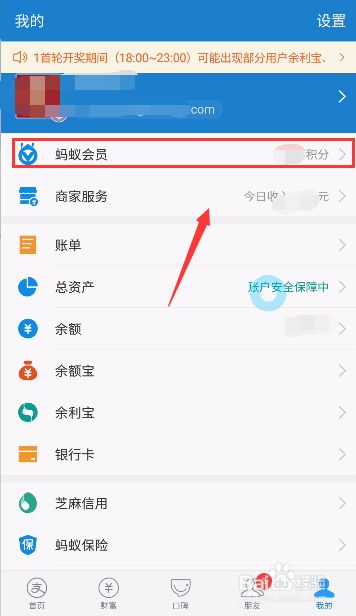 进入我的主页,点击上面的蚂蚁会员选项卡,如下图所示