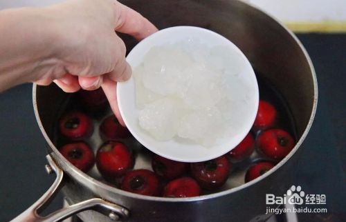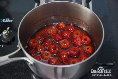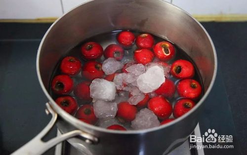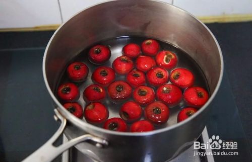 3、用这个方法将全部的红果处理好,放入煮锅中,加入冰糖。