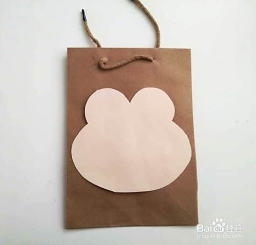 把青蛙的脸部粘贴在纸袋上面。
