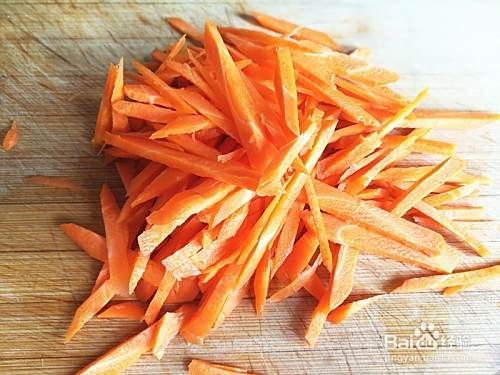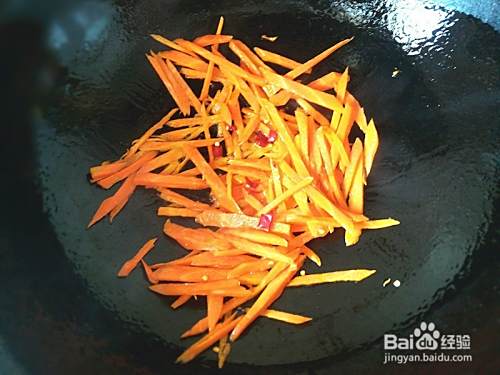 上炒菜锅,倒入适量的植物油烧热,放入切好的胡萝卜条翻炒1分钟。