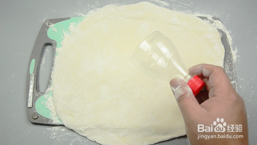 然后把面团放在桌面上,用一个空的啤酒瓶按压面团,按压成薄薄的面皮。面皮的厚度直接影响着饺子皮的厚度。