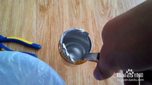 然后我们首先需要把易拉罐瓶子的盖子去掉,用钳子衣典一点一点的去掉。让上面的开口和瓶子一样的整齐。