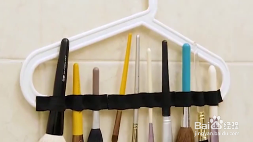 在衣架上才两个小孔,粘贴上布条,这样存放刷子很方便
