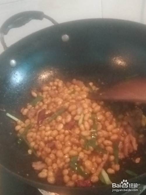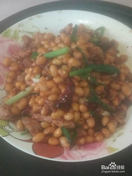 瘦肉至锅边,将切好的蒜瓣、姜丝、干辣椒爆香,再倒入煮好的黄豆一起翻炒,最后撒上食盐、花椒粉、白醋、香葱等翻炒均匀即可食用。
