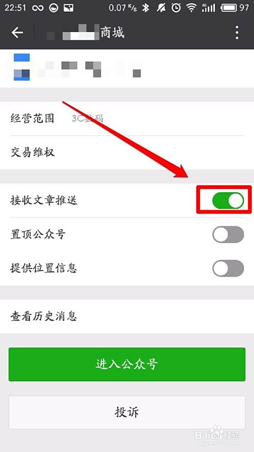 在公众号的信息界面中找到“接收文章推送”的栏目,点击该栏目右边的开关按钮,关闭该按钮即可屏蔽该公众号的文章推送