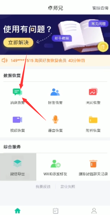5在首页点击“消息恢复”,导出需要恢复的聊天记录。