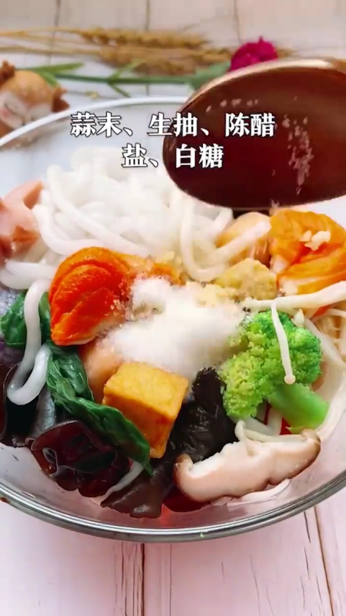 加入蒜末,生抽,陈醋,盐,白糖。