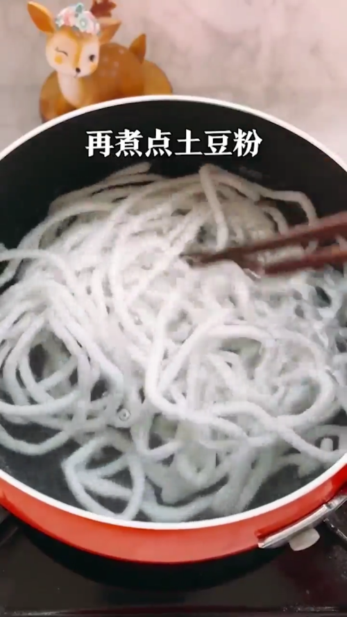 放入土豆粉,煮熟后捞出放入碗中。