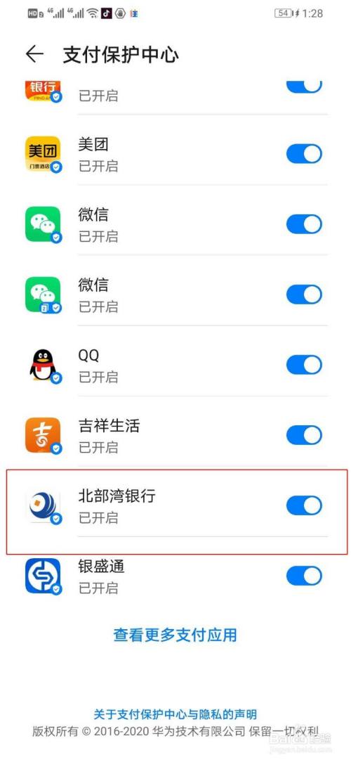 华为手机如何关闭北部湾银行支付保护中心
