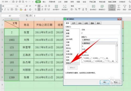 弹出【单元格格式】的对话框,在分类下选择【自定义】,如下图所示: