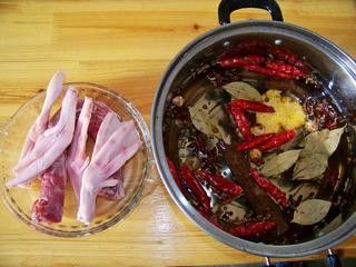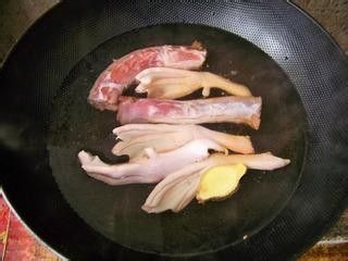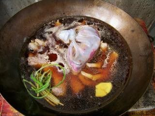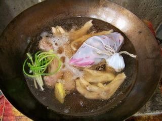 下高汤,冷汤时下鸭掌、鸭脖、卤药包、葱结、姜片,大火烧开