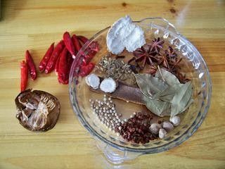 八角、桂皮、花椒、小茴香、丁香、香叶、白胡椒粒、白蔻、罗汉果、白芷、陈皮、干辣椒洗净,泡水出香,装进煲鱼袋待用。