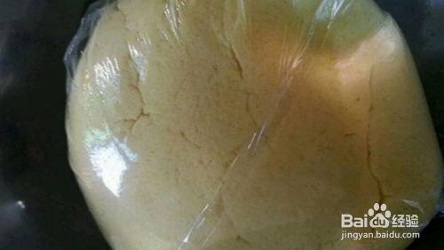 接下来,等待5分钟之后,把玉米面和面粉都放入搅拌均匀的牛奶中然后搅拌成均匀的面团,在表面加上少量的水排湿,在盖上保鲜膜发酵3-5小时,直到面有孔。如下图。
