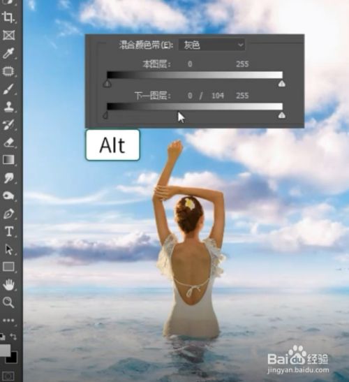 双击图层按住Alt键拉动滑块,天空和人物还是不融合,选择人物图层,点击图像里的匹配颜色。源选择.psd文件,图层选择背景层,效果完成。请看前后对比,记得点赞关注哟。