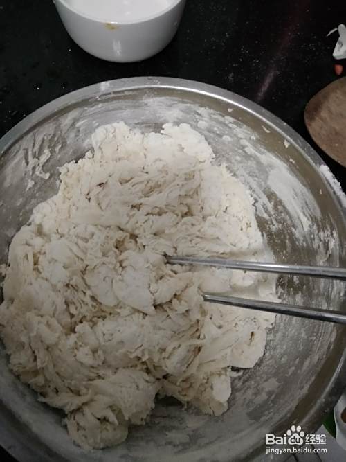面粉加点盐,然后选取酵母拌水后和面,和面效果成雪花状,揉好的效果。