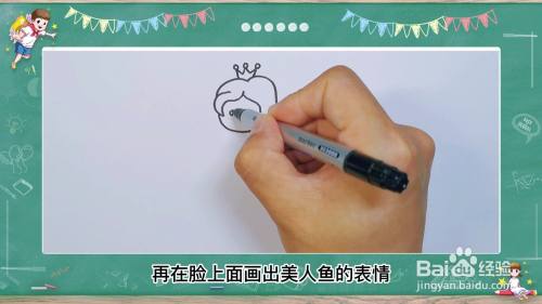 1画美人鱼面部及五官 首先用波浪线画出美人鱼的头发,以及脸,再在脸上面画出美人鱼的表情。